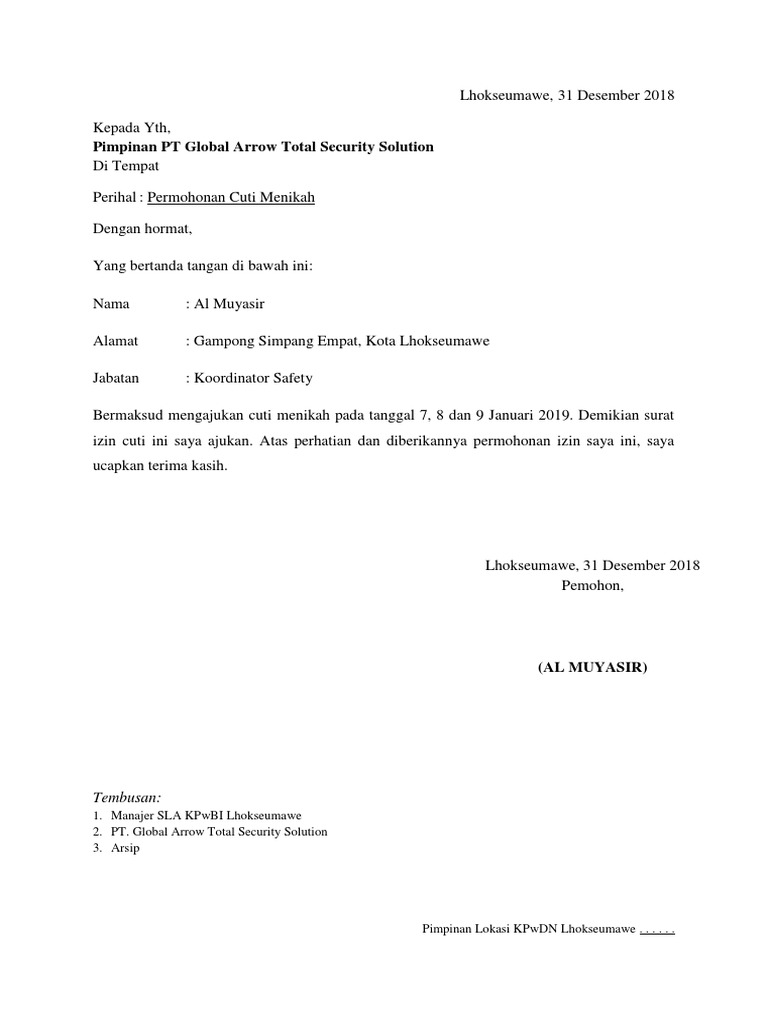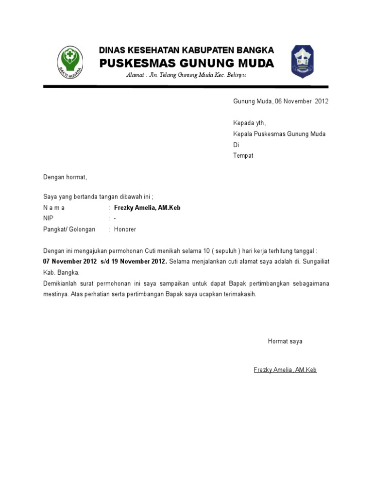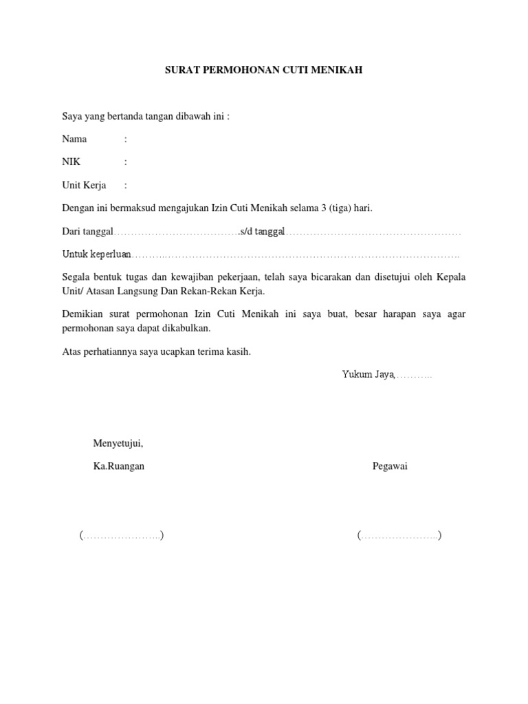 Pengusaha yang tidak memberikan izin menikah atau memberikan izin tetapi tidak membayar penuh upahnya selama 3 hari, maka diancam sanksi pidana. Tidak heran jika harus ada banyak persiapan menjelang pernikahan sampai dengan dilaksanakannya pernikahan tersebut. Pegawai negeri sipil alamat tempat tinggal. Ada beberapa persyaratan yang perlu dipenuhi dalam proses pernikahan, salah satunya adalah pembuatan surat nikah atau buku nikah. Contoh surat izin menikah di luar negeri. Jika kamu belum menikah dan berencana untuk mengambil libur kerja karena acara tersebut, maka kamu bisa mengajukan izin cuti. Bagi anda yang bekerja sebagai seorang pns juga bisa saja mengambil cuti menikah selama beberapa hari. Bagi anda yang bekerja sebagai seorang pns juga bisa saja mengambil cuti menikah selama beberapa hari. Berikut contoh surat cuti menikah yang berlaku bagi guru. Pentingnya bagi pasangan yang akan menikah untuk memiliki surat nikah. Contoh surat izin cuti menikah pdf suratmenyurat net 10 contoh surat cuti melahirkan kerja menikah berbagai 21 contoh surat izin tidak masuk kerja. Begitupula jika suatu karyawan ingin melangsungkan pernikahan, kita harus membuat surat izin cuti untuk menikah. Kali ini kami akan membehas tentang surat.