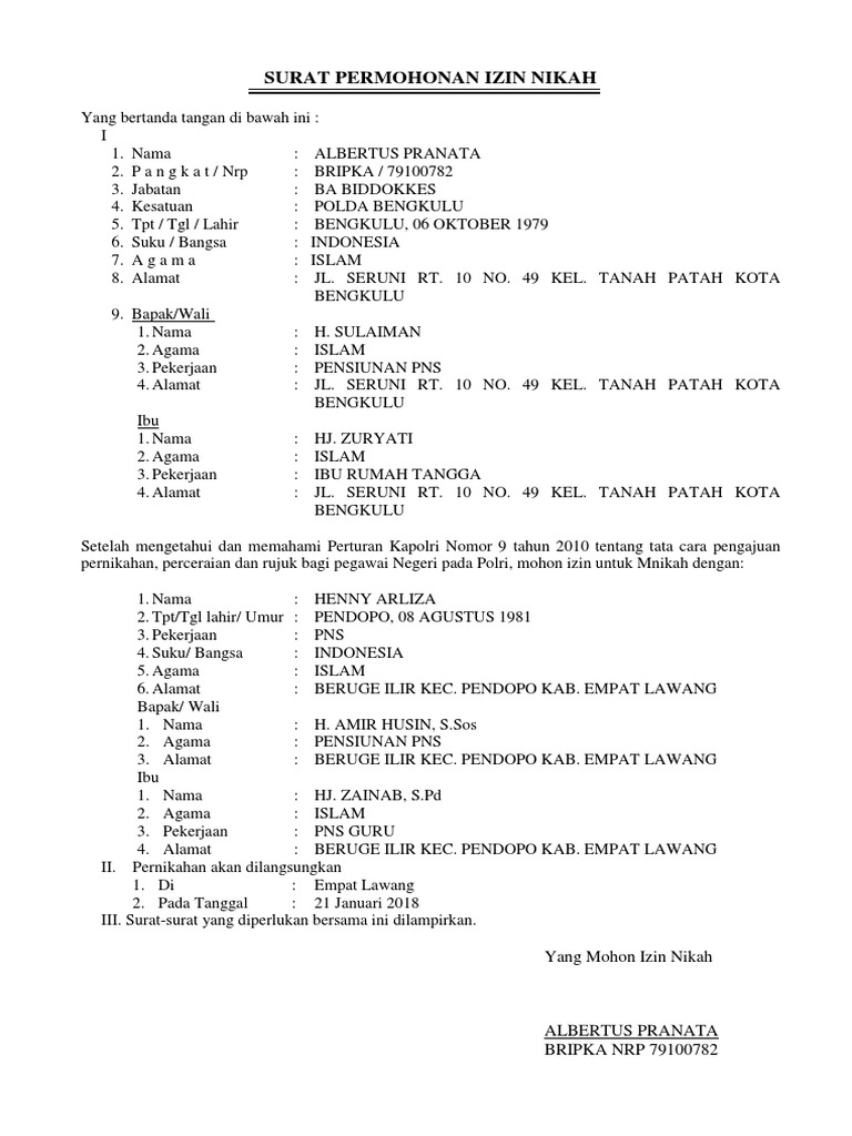 Surta Izin Menikah Contoh Surat Izin Menikah Lagi Dari Istri Pertama Cute766 Setelah 15 Tahun Ditinggal Mati Suaminya Dan Tenggelam Dalam Kesibukan Lalu Atas Atas Nasihat Dr Inmortellex from i2.wp.com Contoh surat izin tidak masuk kerja. Contoh surat cuti menikah untuk guru 1. Doc surat izin menikah dan cuti menikah dhanur dwi format 612 x 1008. Jika kamu belum menikah dan berencana untuk mengambil libur kerja karena acara tersebut, maka kamu bisa mengajukan izin cuti. Pegawai negeri sipil alamat tempat tinggal. Berikut contoh surat cuti menikah yang berlaku bagi guru. Usahakan untuk memberikan izin cuti menikah beberapa hari. Berikut ini contoh surat pernyataan perseorangan yang menyatakan bahwa yang bersangkutan belum pernah menikah dengan siapapun baik secara hukum adat hukum agama maupun hukum negara yang ditanda tangani di atas materai dan diketahui oleh orang tua serta kepala desa setempat sebagai salah satu syarat berkas nikah.